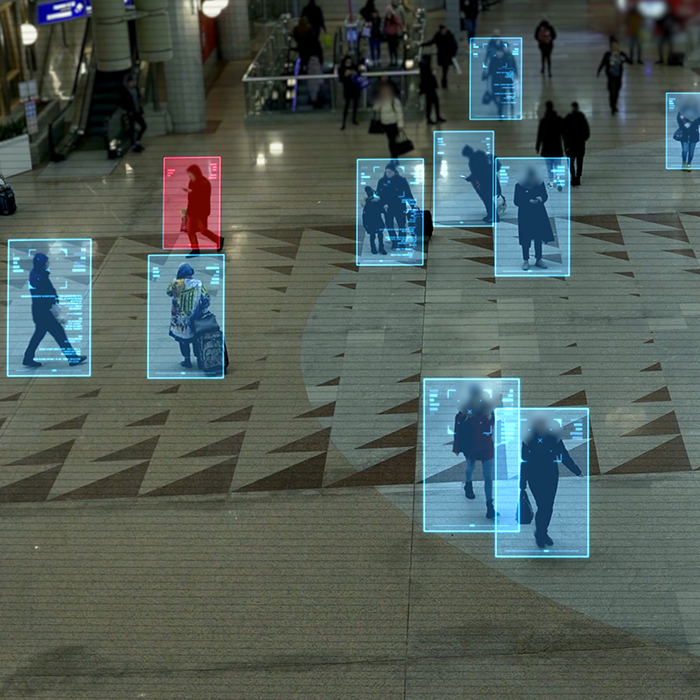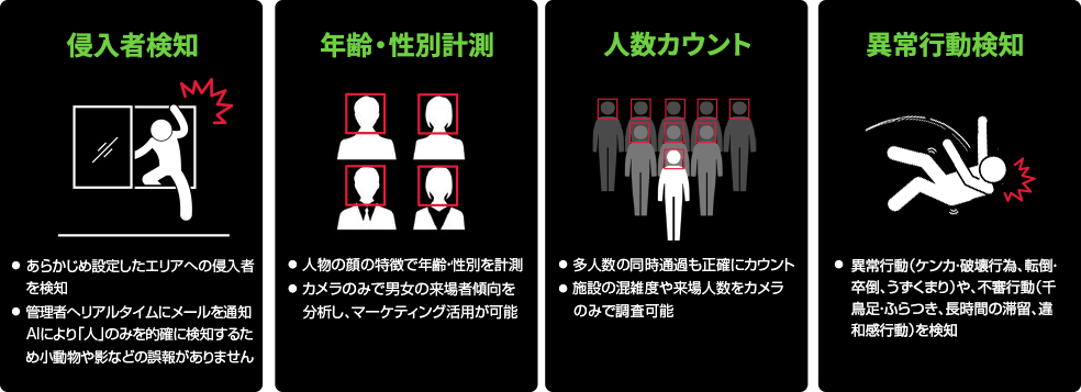 特定人物の検知、不審行動検知、禁止エリアへの人の侵入検知、滞在人数や来場者数のカウント、異常挙動(うずくまり・転倒)などをリアルタイムに検知。 AI Management System「AIMS」がAI検知情報をメタデータとして一括管理し、利用者の目的に合わせて優先度の高い情報を選別して通知します。 長年の研究開発で培った認識精度は様々な業界で高い評価を受け、大型商業施設、オフィスビルなど、多数の導入実績を誇ります。