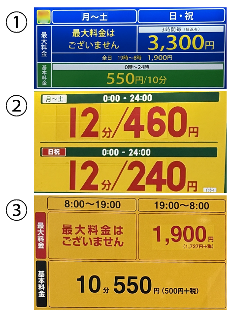 掲示板に並んだ料金、①~③——どこが一番安いの??