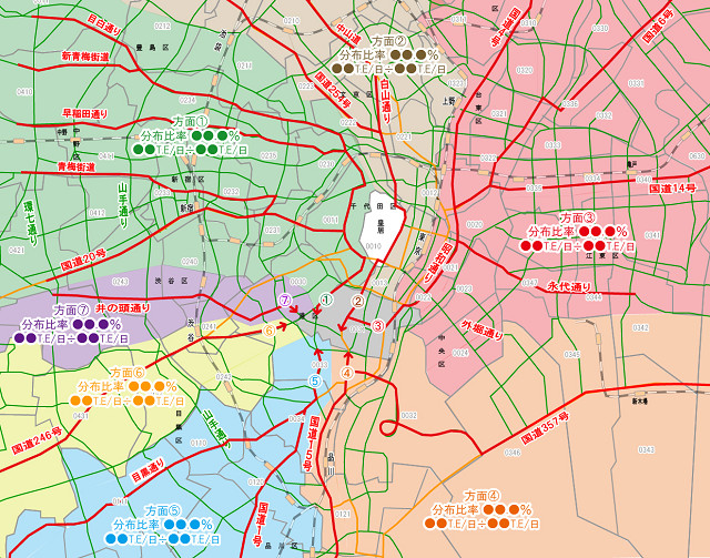 ただしそれは、その計画建物を出入りするであろう交通量を予測したもので、より詳細には、交通手段別のアクセス経路(動線)を設定し、その経路別に比重(方面比)を施して周辺道路に配分する作業が必要になります。