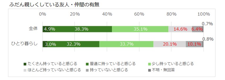 また、単身高齢者の場合、総世帯と比較してもふだん親しくしている友人・仲間が少なくなる傾向があることを示す調査結果もあります(※2)