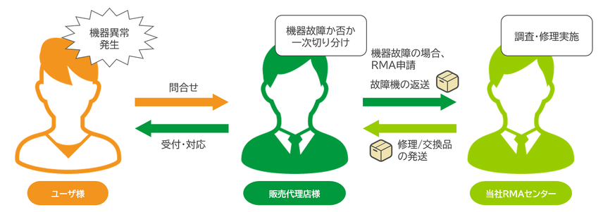 RMA対応とは、機器に故障が発生した場合、故障機を当社指定先へご返送いただき、エンジニアにより不具合箇所特定の上、正確な修理または良品への交換を行うサービスのことです。